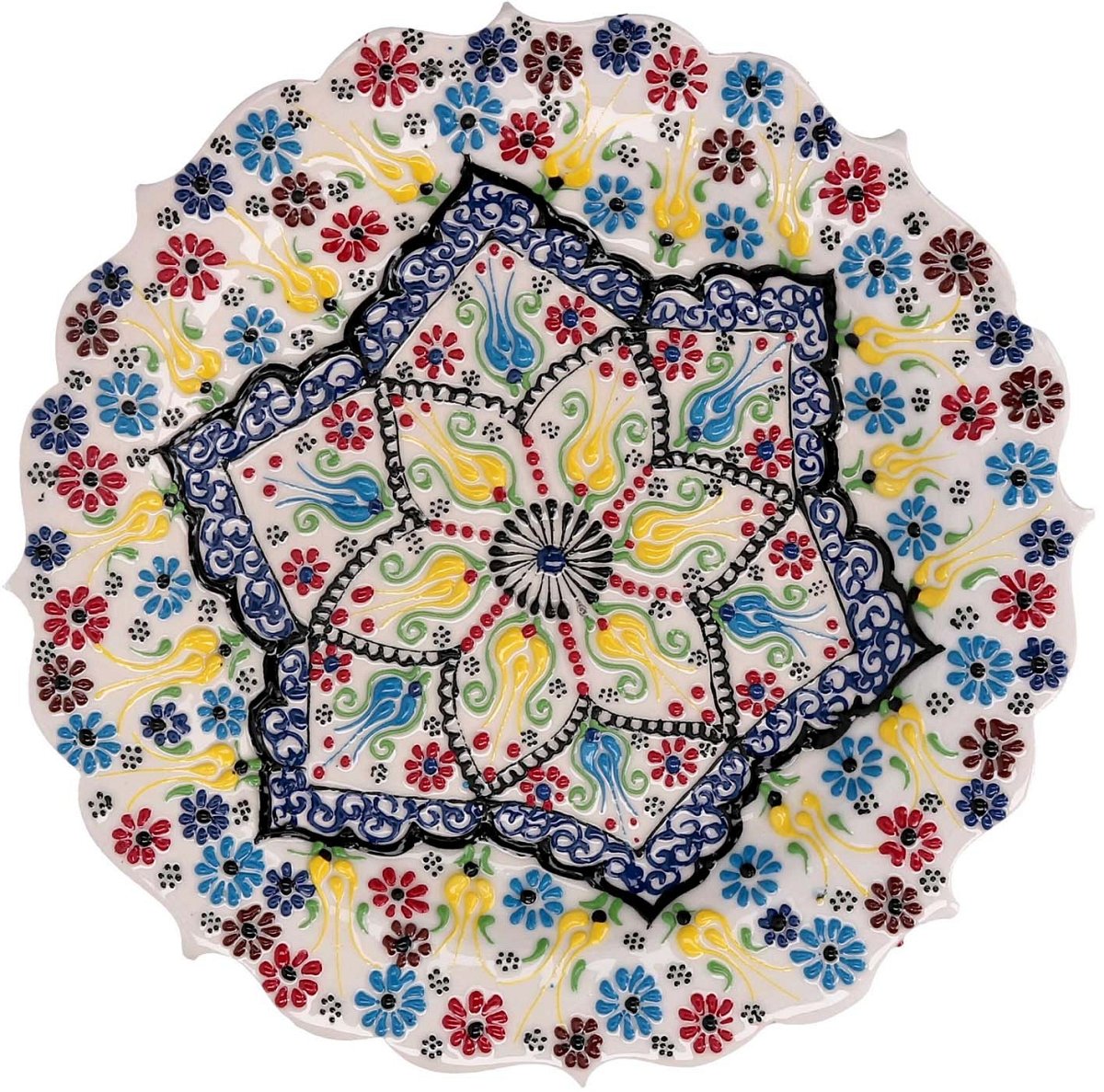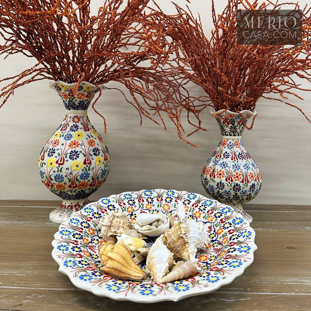 Originale e colorato piatto in ceramica con fiori sui toni del giallo, del blu e del rosso.