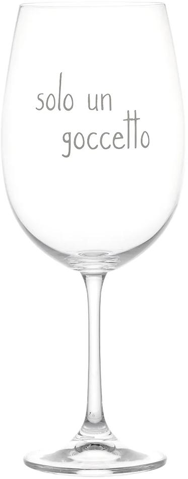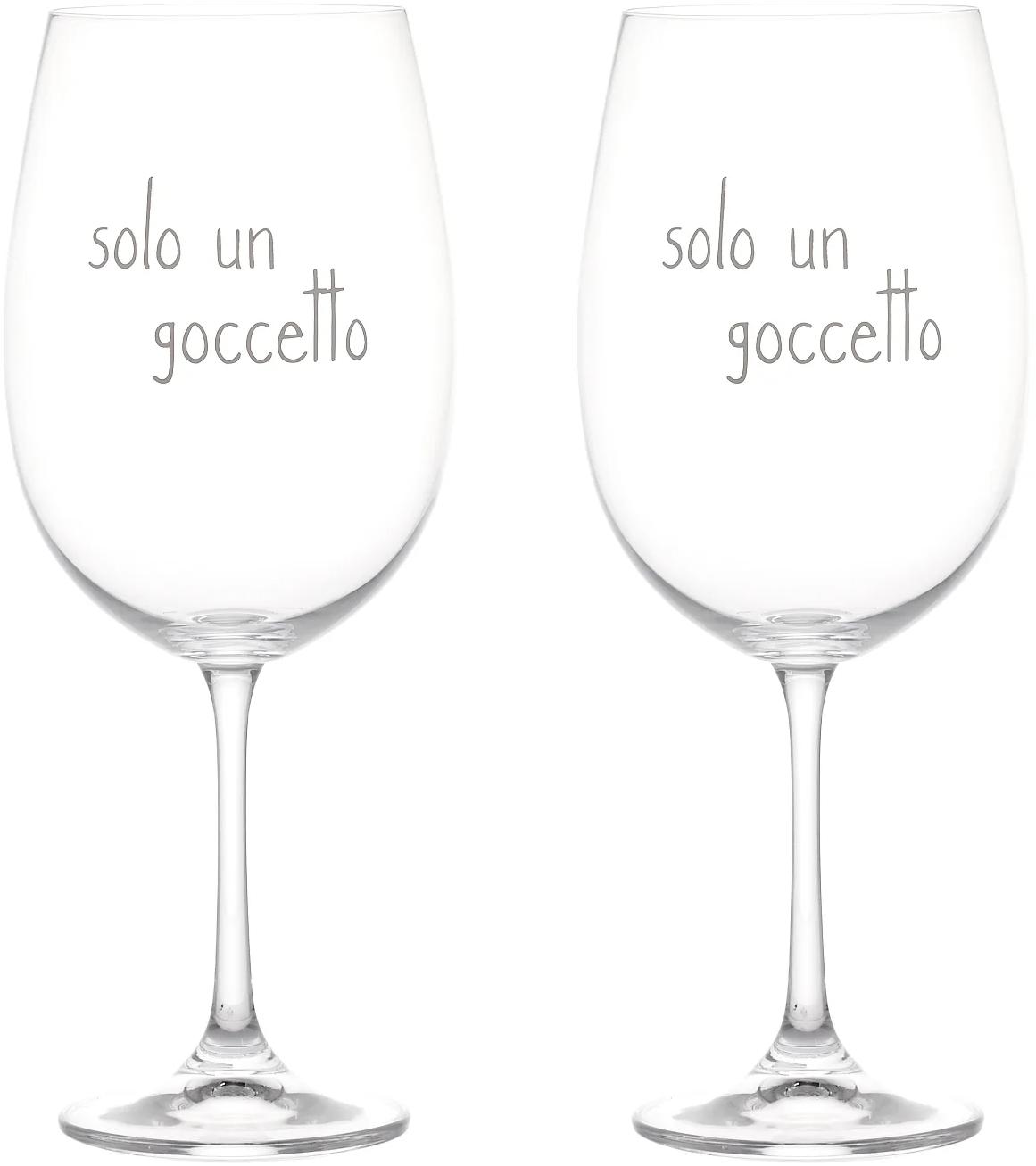 Bellissimo Set da 2 Calici da Vino con simpatico Decoro Scritta "Solo un Goccetto" in colore bianco.