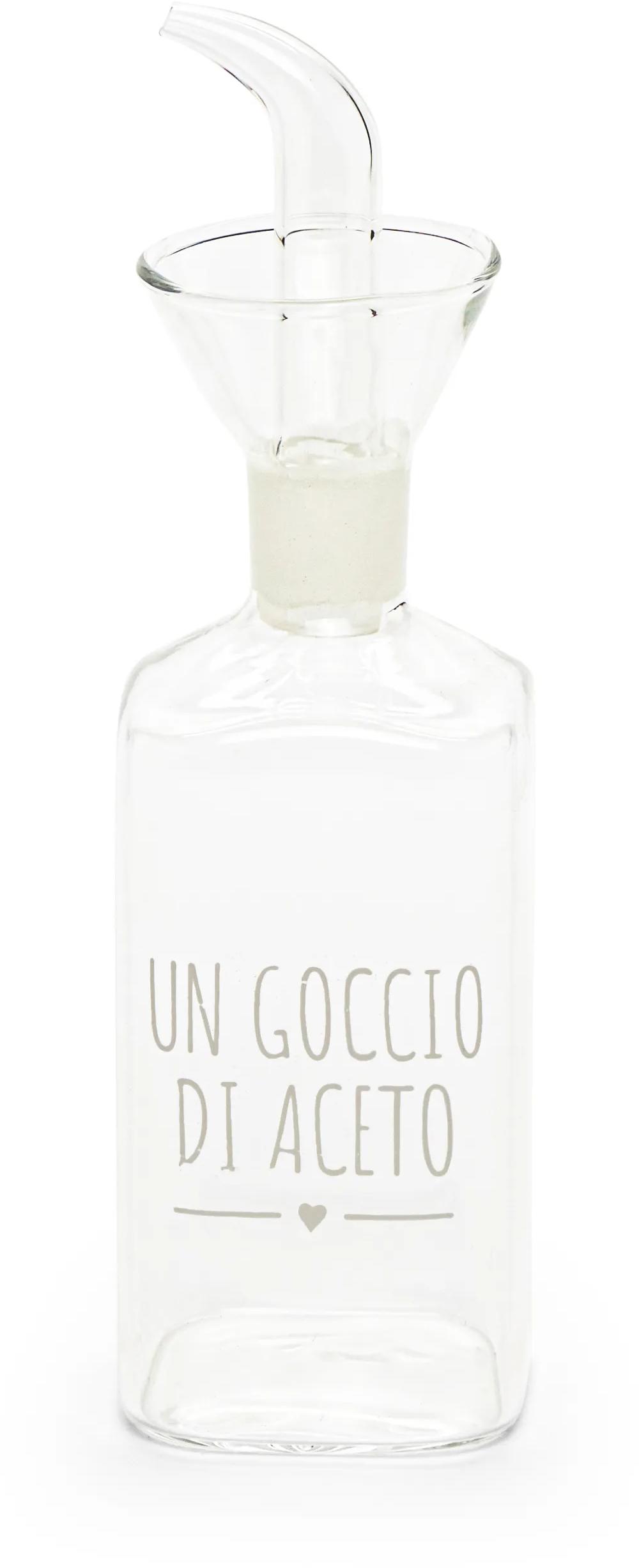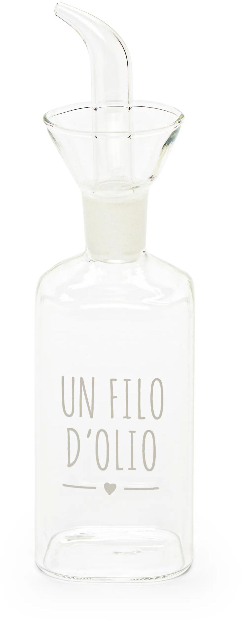 Originale Set Olio e Aceto realizzato in Vetro Borosilicato con Scritte Decorative "Un Filo d'Olio" e "Un Goccio di Aceto". Ideale da raglare, questo Set è corredato di Scatola. Capacità 250 ml
